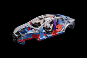 Ein weiterer wichtiger Aspekt in Sachen Sicherheit bei E-Fahrzeugen ist der Schutz und die Crashsicherheit der Hochvoltbatterien. Einerseits dürfen die im kompletten Fahrzeugboden untergebrachten Akkus keinen Schaden nehmen. Auf der anderen Seite muss das HV-System – HV-Komponenten sind außer der Batterie alle Komponenten mit einer Spannungslage von mehr als 60 Volt – bei einem schweren Unfall sekundenschnell abgeschaltet werden.