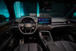 Wie üblich bei Cupra ist der Armaturenträger auf den Platz am Lenkrad ausgerichtet. Ein Cupra-Sprecher sagt dazu: „Frau oder Mann am Steuer stehen als Hauptdarsteller im Mittelpunkt.“ Diese Hauptdarsteller sitzen ebenso wie die Beifahrer serienmäßig auf Schalensitzen. Die tragen immer das Cupra-Logo in der Kopfstütze und Kupfernähte, die auf die Kupferumrandungen der Lüftungsschlitze, Türleisten und dekorativen Einsätze abgestimmt sind. Das Multifunktions-Lenkrad ist mit Schaltwippen bestückt, um auf Wunsch manuell die Gänge zu wechseln.