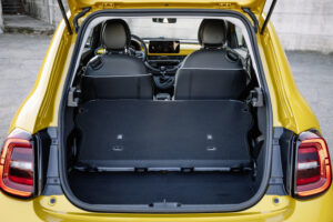 Lediglich beim Ein- und Aussteigen ist eine gewisse Beweglichkeit notwendig. Denn selbst wenn die vorderen Sitze ganz nach vorne gerutscht werden, ist der Zugang noch immer recht schmal. Aber – der Fiat 500 ist halt ein Kleinwagen. Das zeigt sich ebenfalls beim Volumen des Kofferraums. 183 Liter stehen hinter ein großen Klappe zur Verfügung. 440 Liter sind es, wenn die einteilige hintere Lehne vorgeklappt wird.
