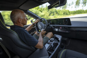 Wir hatten jetzt erstmals die Möglichkeit, den EV6 GT ausgiebig sowohl auf einer abgesperrten Teststrecke als auch auf Landstraße und Autobahn zu fahren. Danach steht fest: Dieser elektrisch angetriebene Kia übertrifft selbst die aufgrund der Papierform schon hochgesteckten Erwartungen. Kraft, Agilität, Dynamik und Handling sind über jede Kritik erhaben. Ob beim Antritt aus dem Stand, beim Beschleunigen oder bei extrem schnellen Kurvenfahrten – der Kia EV6 GT überzeugt mit einem hohen Maß an Performance. Es ist schon echt beeindruckend, mit welcher Leichtigkeit und Souveränität sich der doch immerhin 2,2 Tonnen schwere Wagen bei hohem Tempo auf dem Rundkurs mit vielen engen Kurven bewegen lässt. Kreuzbrav bleibt der EV6 GT in der Spur, verzeiht dabei sogar bewusst provozierte Fahrfehler. Das liegt natürlich vor allem an den im Vergleich zum EV6 umfassenden Veränderungen an den Fahrwerkskomponenten und den elektronischen Steuerungssystemen. Die Radaufhängung des GT beinhaltet neue Federn, die die Karosseriebewegungen reduzieren und die Agilität steigern. Sie sind im Vergleich zum EV6 vorn um neun Prozent weicher und hinten um elf Prozent straffer. Der hintere Stabilisator ist um 15 Prozent steifer als beim EV6. Eine elektronische Dämpferkontrolle sowie ein elektronisches Sperrdifferenzial unterstreichen die sportlichen Ambitionen des GT. Das Sperrdifferential leitet bei Kurvenfahrten das Drehmoment automatisch an die Räder mit dem stärksten Grip und sorgt so dafür, dass keine Leistung verloren geht und größtmögliche Stabilität und Traktion sichergestellt ist. Das alles trägt dazu bei, dass die Wankneigung in Kurven mit hoher Geschwindigkeit auf ein Minimum reduziert wird. Der Gran Turismo bleibt auch beim harten Anbremsen gut beherrschbar, taucht nicht ein.