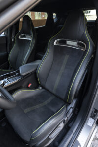 Im Innenraum des GT gibt es wie schon im bekannten Kia EV6 Platz satt. Vorne nehmen Fahrer und Beifahrer auf schwarzen Schalensitze mit veganen Bezügen in Wildlederoptik Platz. Die Seitenwangen geben bei sportlicher Fahrweise einen extrem guten Seitenhalt, sind zudem so geformt, dass sie nicht nur für extrem schlanke Personen bequem sind. Die Polsterung ist bestens, so dass auch die längere Strecke zu genießen ist. Metallapplikationen mit „GT“-Schriftzug und neonfarbene Akzente unterstreichen das dynamische Erscheinungsbild. Ein Streifenmotiv ziert das Armaturenbrett und die Mittelarmlehne vorn, die Ambientebeleuchtung in den Türverkleidungen, der Mittelkonsole und dem Armaturenbrett schafft bei Dunkelheit eine angenehme Atmosphäre.