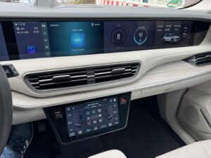 Das eigentliche Aha-Erlebnis indessen stellt sich im Innenraum ein. Denn vor den beiden vorderen Plätzen zieht sich ein riesiger Bildschirm über die gesamte Fahrzeugbreite. Darunter liegt ein Acht-Zoll-Monitor, über den unter anderem die Klimaanlage gesteuert wird. Außerdem können fast alle weiteren Funktionen hier angewählt werden.